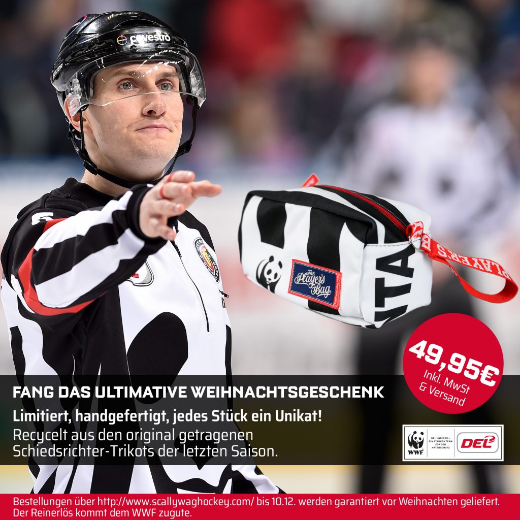 Die Schiedsrichter der Deutschen Eishockeyliga liefen in der vergangenen Saison im Panda Look aufs Eis. Die Restbestände der Trikots wurden jetzt zu Waschbeuteln upgecycelt.