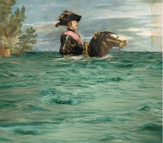 Wenn die Klimakrise auf alte Meister trifft: Anlässlich der in Madrid laufenden Klimaverhandlungen haben das Prado Museum und der WWF Spanien in einer spektakulären Aktion Kunst und Umwelt zusammengebracht. Im Originalbild von Diego Velázquez schaut König Philipp IV stolz auf seine Ländereien. Nach dem Abschmelzen der Pole ist von denen aber nicht mehr viel zu sehen.